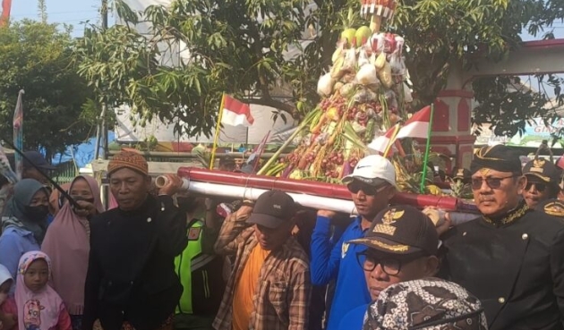 Gunungan hasil bumi diarak keliling kampung dib Desa Grinting Kecamatan Bulakamba.